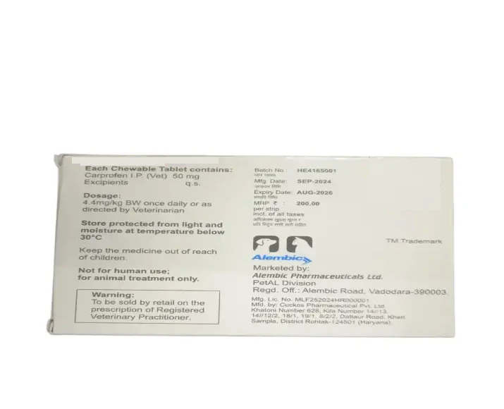 Alembic SuccedAL 50 MG is a trusted veterinary analgesic and anti-inflammatory medication containing Carprofen, one of the most widely used NSAIDs in veterinary medicine. Carprofen is known for its targeted action against pain and inflammation while maintaining a favorable safety profile when administered correctly. It is especially effective in managing chronic conditions like arthritis as well as acute pain following surgery or injury.