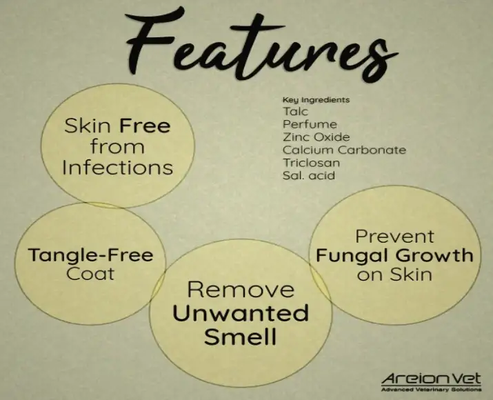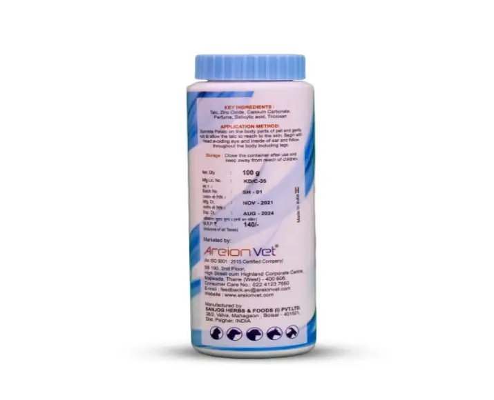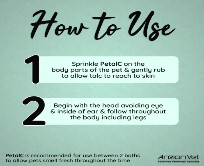 Areion Vet PetalC Ultra Fine Perfumed Talc designed with both comfort and convenience in mind, this talc not only keeps your pet’s coat dry and fresh but also helps reduce discomfort associated with itching and sweating. it’s especially helpful in warmer climates or during humid seasons when pets tend to sweat more and fur traps moisture easily.