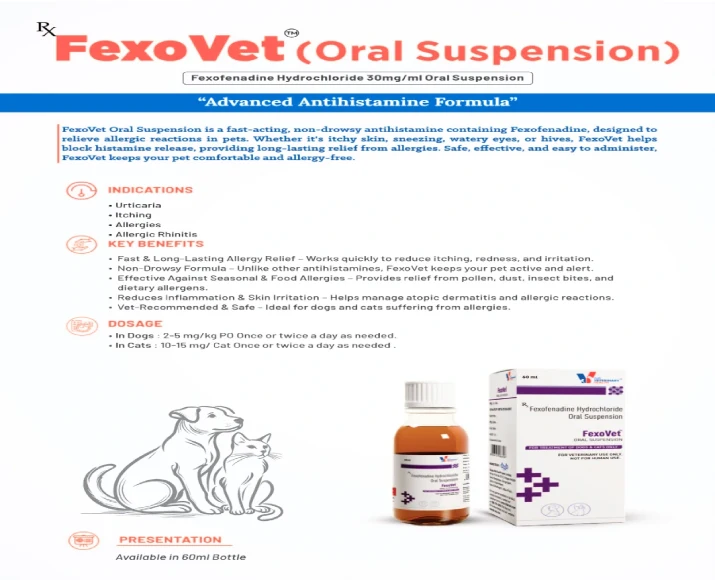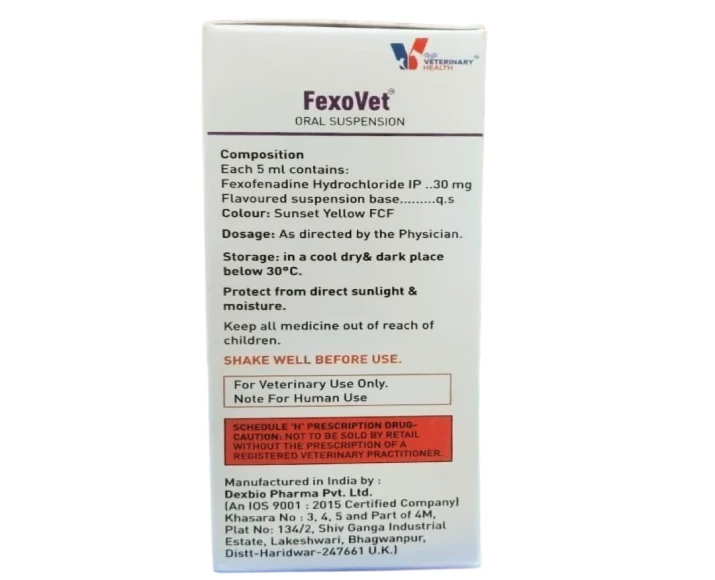 Drools FexoVet Oral Suspension typically contains an antihistamine-based veterinary formulation designed to manage allergic responses in pets.