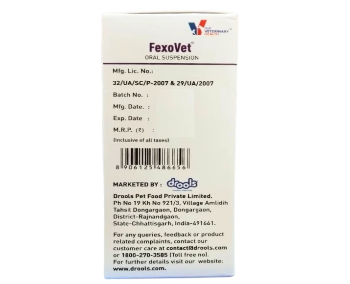 Drools FexoVet Oral Suspension offers a convenient and reliable way to manage allergy symptoms in dogs and cats. Its liquid formulation ensures easy dosing and better compliance, particularly for pets that struggle with tablets. With systemic antihistamine action, it helps control symptoms effectively and supports long-term comfort.