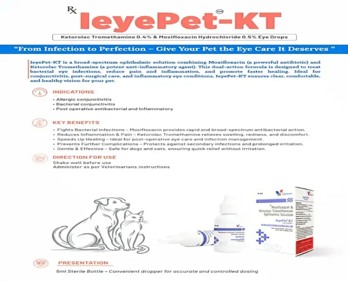 Drools LeyePet KT Eye Drops work by delivering active ophthalmic agents directly to the affected eye. These agents help calm inflamed eye tissues, reduce redness, and relieve discomfort associated with inflammatory eye conditions.