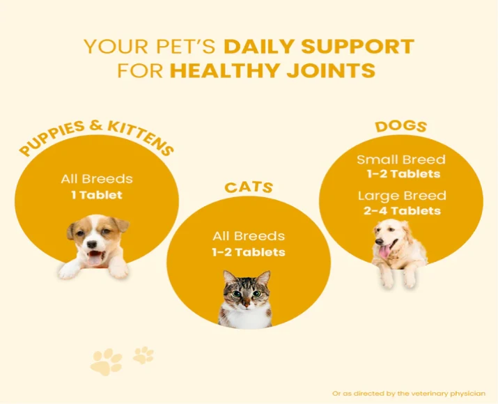 Together, these components help lubricate joints, reduce friction, relieve pain, and improve flexibility. With regular use, the tablets support long-term joint health and help pets maintain an active lifestyle.