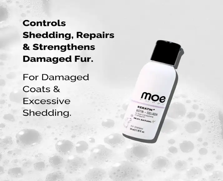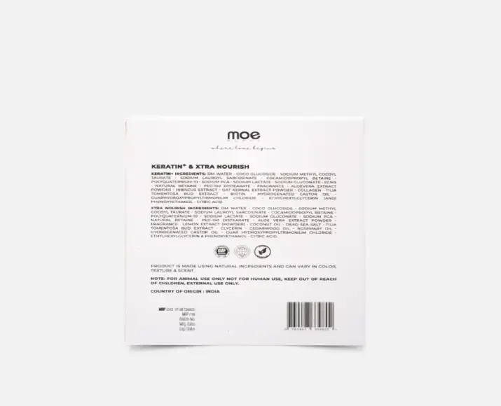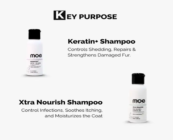 The Moe Puppy Discovery Pack is thoughtfully designed to provide complete coat care for your little furry companion. This convenient combo includes two expertly crafted shampoos—Keratin Plus Shampoo and Xtra Nourish Shampoo—each in a travel-friendly 50 ML size, making it perfect for first-time use or trial before committing to full-size products.