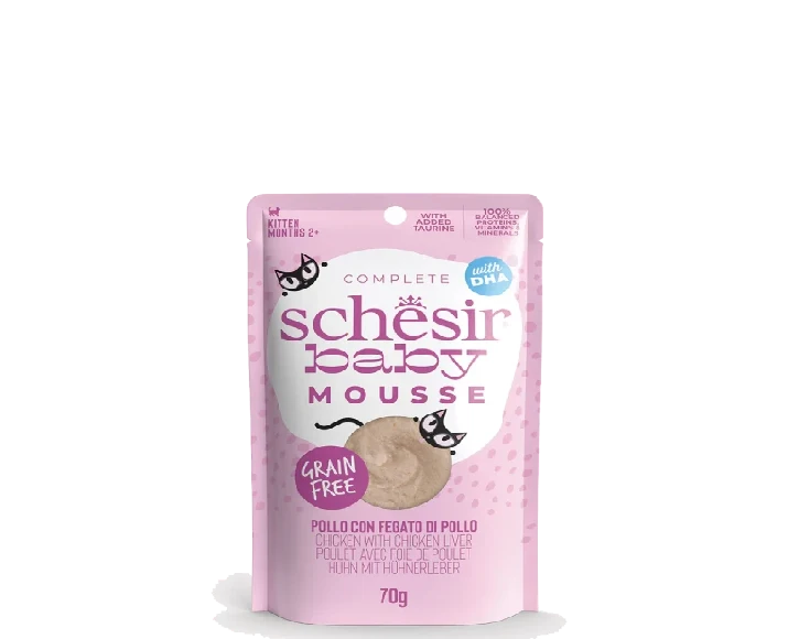 Open the pouch or can of Schesir Chicken with Chicken Liver Kitten Mousse and serve at room temperature.
