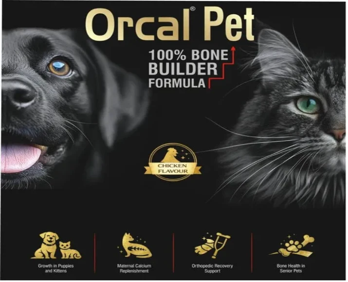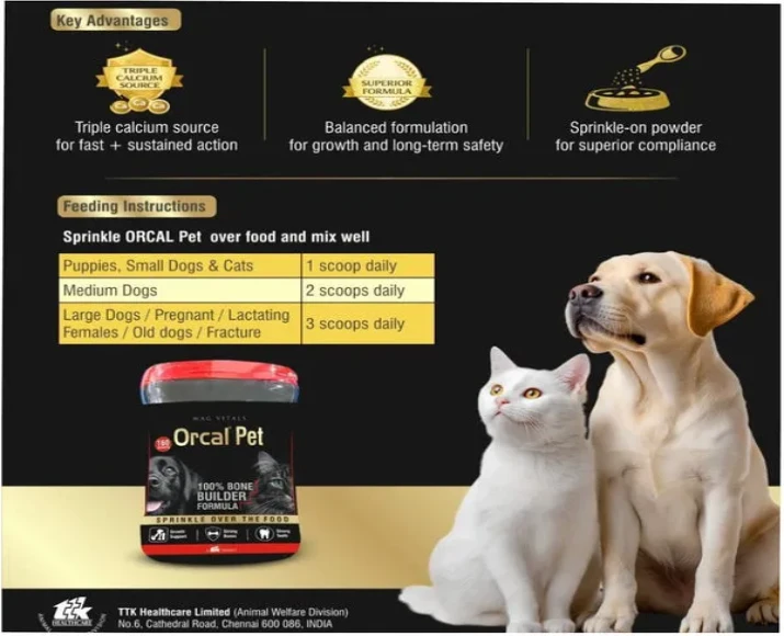 TTK Orcal Pet Bone Builder is a calcium and mineral supplement used to support strong bones, healthy teeth, and skeletal development in dogs and cats.