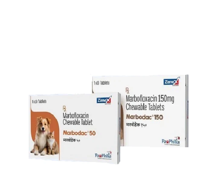 Zenex Marbodac Tablet for Dogs & Cats is a highly effective antibiotic solution designed to combat a wide spectrum of bacterial infections. Its active ingredient, marbofloxacin, belongs to the fluoroquinolone class and is known for its strong bactericidal action. This makes it suitable for treating infections of the skin, soft tissues, urinary tract, respiratory system, and ears, as well as wound infections.