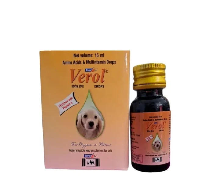 Zenex Verol Drops contains a rich blend of essential vitamins such as Vitamins A, D, and E, along with additional nutrients that support vital bodily functions. Vitamin A helps maintain healthy vision, skin, and immunity. Vitamin D plays an important role in bone strength and calcium absorption, especially for growing pups and kittens. Vitamin E works as a powerful antioxidant that protects cells and supports reproductive and muscular health.
